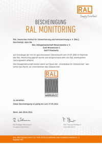 Mit der aktuellen Bescheinigung wird bestätigt, dass die Gütegemeinschaft Mineralwolle e. V. ordnungsgemäß arbeitet und damit weiterhin das Recht hat, das RAL-GZ 388 (RAL Gütezeichen – Erzeugnisse aus Mineralwolle) an Unternehmen zu verleihen.